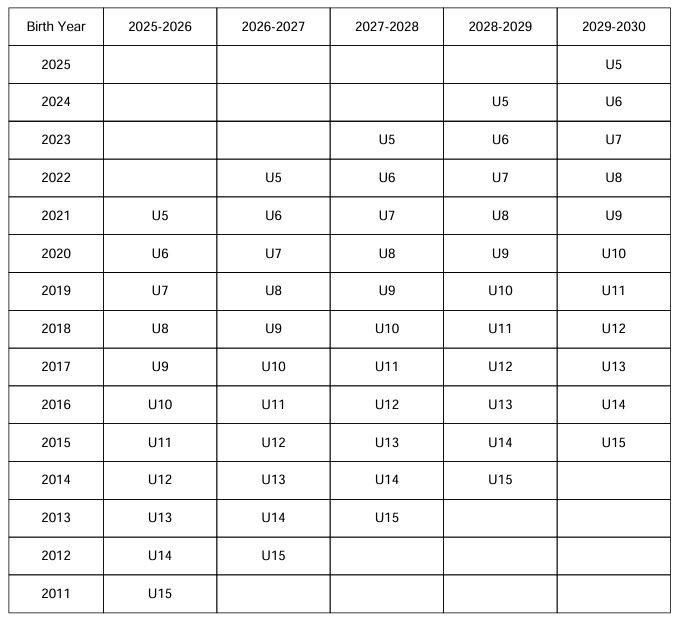 The table shown is the age breakdowns for the listed seasons. The U stands for "under" - for example U5 is for children under 5 years old. Divisions will be U5/U6 combination, U7/U8 combination, U9/U10 combination, U11/U12 combination and U13/U14/U15.
